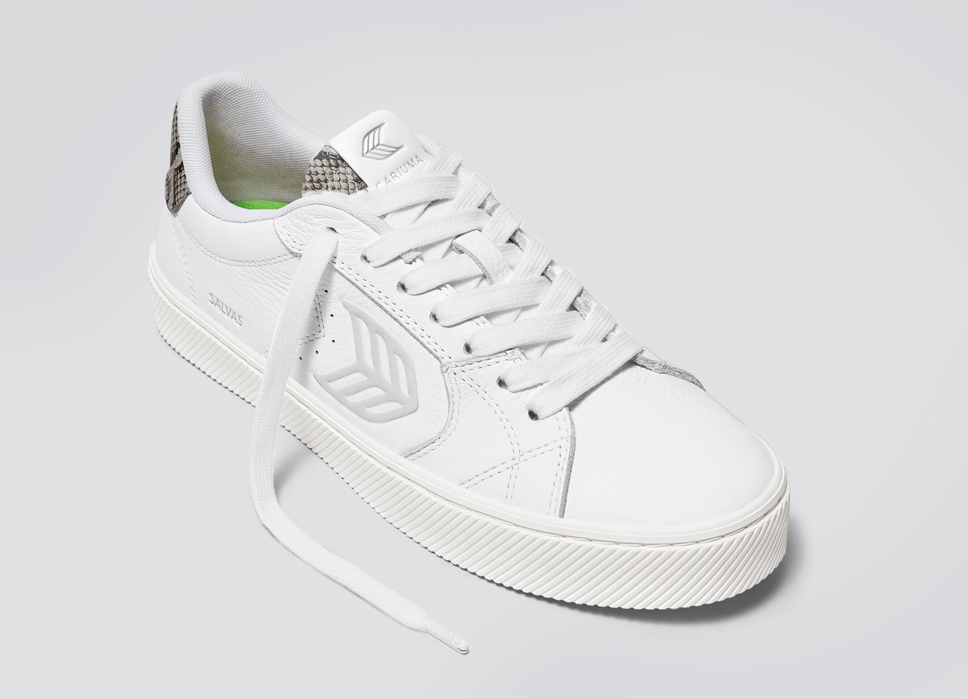 Shop the SALVAS White Leather Silver Cloud Logo Snake Skin Print Sneaker